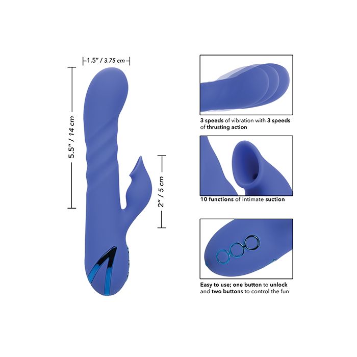 The powerful massager is ready to relive your favorite summer fling fantasies with 10 functions of intimate suction paired with 3 speeds of independent vibration and thrusting action. The sensual shaft features 3 speeds of thrusting action and vibration to make sure you always hit the right spot. While the thrusting action and vibrations work their magic, the full-coverage suction tip gives you knee-shaking suction stimulation. The clitoral encaser has 10 functions of suction for wave after wave of orgasmic external stimulation.
